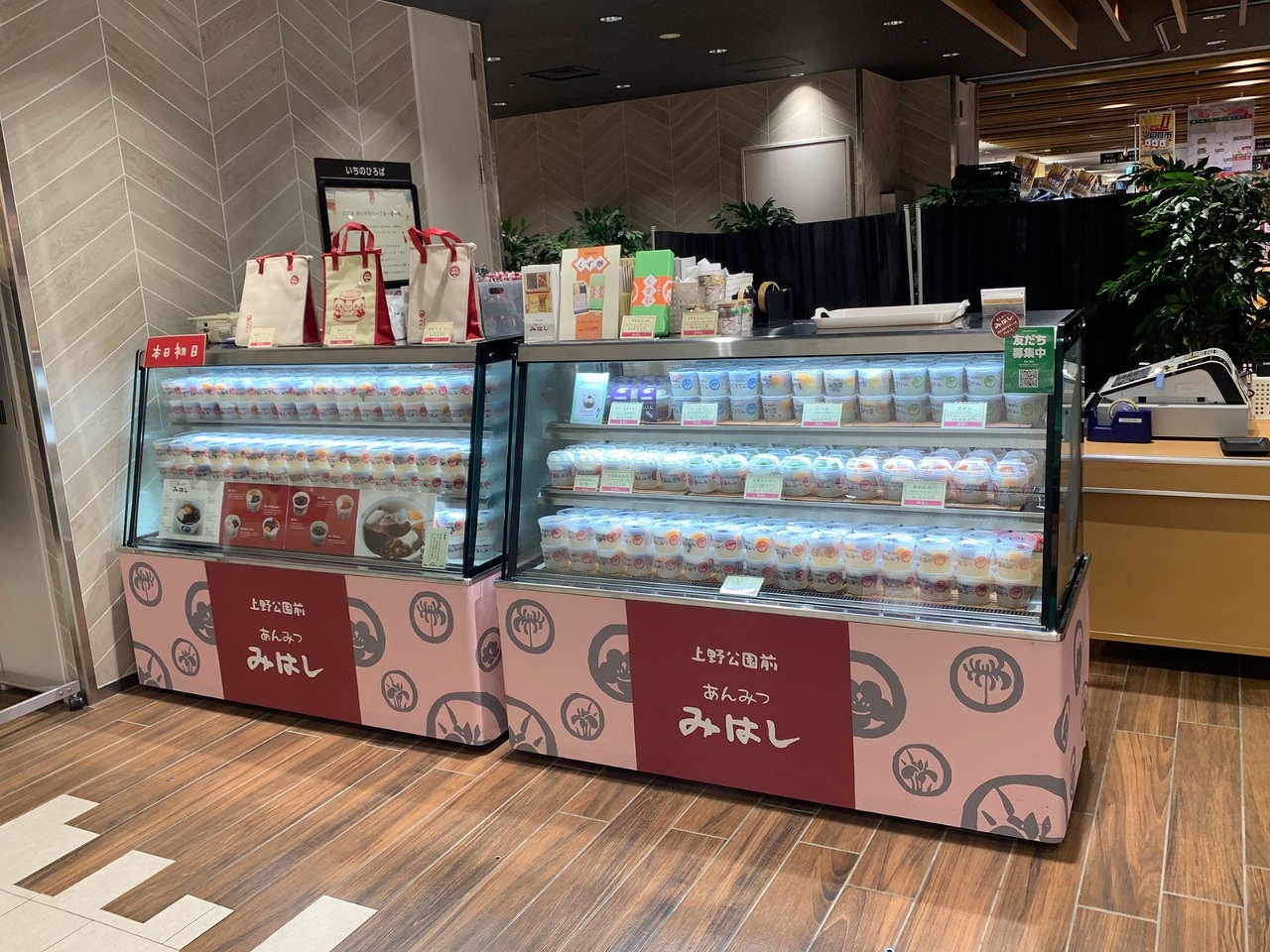 催事スペースでは定番商品の「あんみつ」をはじめ、季節限定のあんみつや「あわぜんざい」も販売いたします。