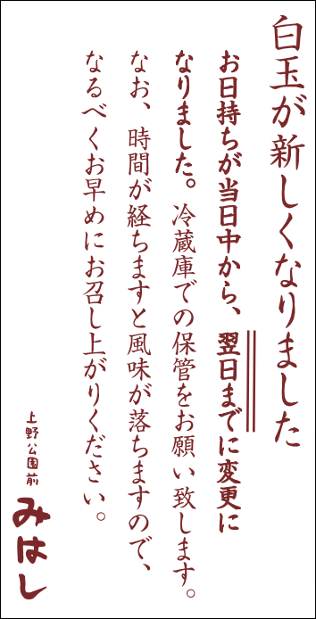 この度、白玉が新しくなり、お土産商品のお日持ちが当日中から翌日中に変更となります。