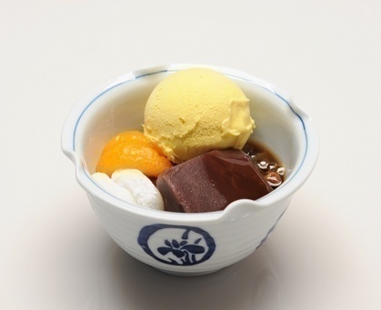 かぼちゃの自然な甘みを活かした自家製かぼちゃアイスをあんみつにトッピングした季節限定メニューです。