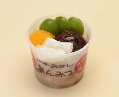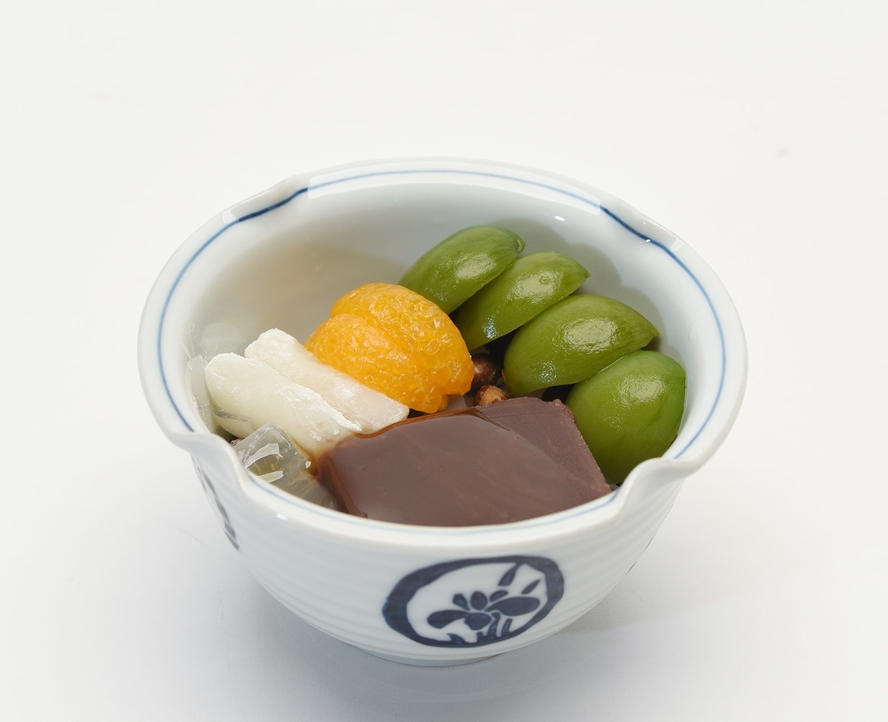 定番メニューのあんみつに食べやすい大きさの若桃の甘露煮をトッピングした、