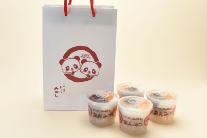 人気のクリームあんみつにシャンシャンの好きな笹をイメージしたよもぎ白玉をトッピング。